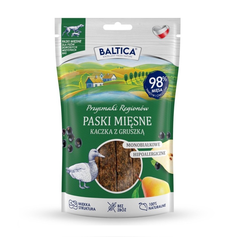 Naturalna przyjemność dla Twojego psa! Mięsne paski od marki Baltica to wyjątkowy przysmak inspirowany regionalnymi smakami, który łączy wysokiej jakości mięso kaczki z delikatną nutą gruszki.