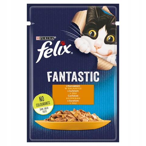Felix Fantastic Kurczak w Galaretce 85g to smakowita, pełnoporcjowa mokra karma dla dorosłych kotów. Odpowiednia także dla kotów wysterylizowanych. Delikatna galaretka a w niej zatopione kawałki soczystego kurczaka dostarczają niezbędnych substancji odżywczych. Karma idealnie nadaje się dla kotów niejadków, gdyż jej smak przypadkie do gustu każdemu czworonożnemu pupilowi. Zbilansowana receptura wspiera zdrowie i dobre samopoczucie kota każdego dnia.