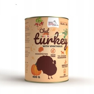 Pełnoporcjowa mokra karma Syta Micha CHEF Indyk z warzywami JUNIOR 400 g, stworzona specjalnie dla szczeniąt wszystkich ras. Formuła o wysokiej zawartości mięsa, bez zbóż, bez kurczaka, soi i laktozy – idealna dla młodych psów i wrażliwego układu pokarmowego.