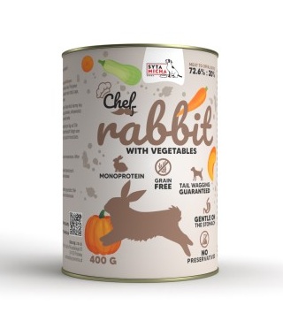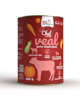 Jedna z lepszych składowo karm mokrych na rynku. Jest źródłem białka niezbędnego do rozwoju mięśni. W karmie znajduje się aż 92.6% mięsa. Syta Micha CHEF to zdrowa, smaczna i pełnoporcjowa karma mokra dla dorosłych psów, której skład został opracowany przez specjalistę żywienia psów. Wybierając właśnie tę karmę możesz mieć pewność, że do organizmu Twojego pupila zostaną dostarczone wszystkie niezbędne składniki odżywcze, witaminy i minerały.